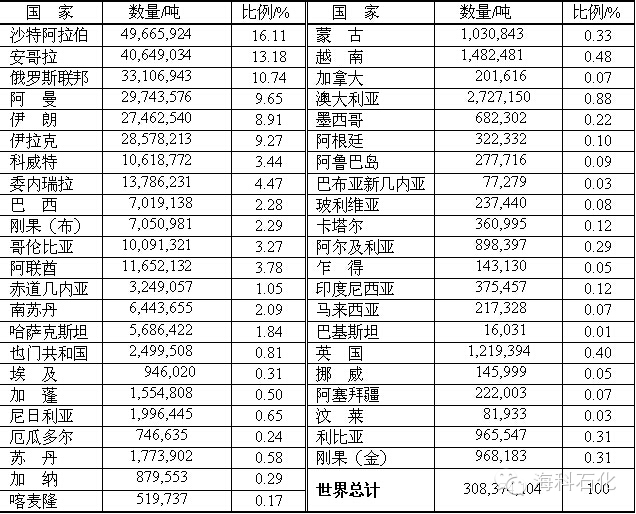 向中国出口原油的主要国家依次是沙特阿拉伯、安哥拉、俄罗斯联邦、阿曼、伊拉克和伊朗等六个国家,占进口总量的68%。历年来,这个顺序变化比较小。中东国家对中国出口原油占48%。表5说明中国从44个国家/地区进口原油的数量和比例。
