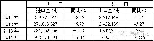 表2为英国路透社发表的中国海关总署的数据,可以看出进口量逐年增高,而出口量却在减少。