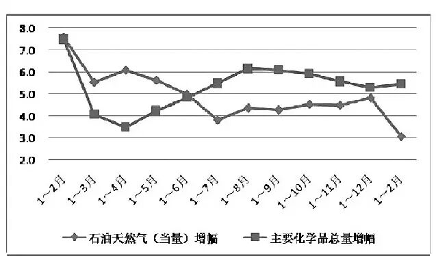 1~2月,全国原油天然气产量5436.9万吨油当量,同比增长2.7%,比上年同期加快0.5个百分点;主要化学品总量增长约7.5%,与去年同期持平。