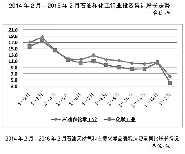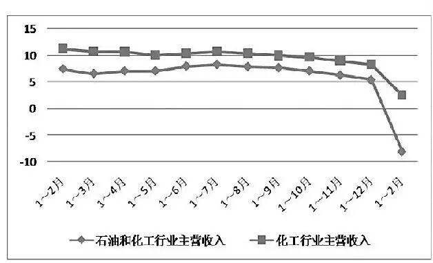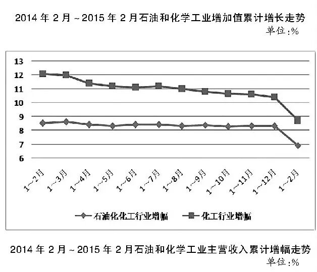 今年1~2月,石油和化工行业经济运行延续上年放缓趋势,下行压力继续增大。全行业增加值增长6.9%,主营收入下降8.1%,固定资产投资增速6.0%,出口总额增长4.2%。油气和主要化工生产总体平稳,市场供需基本稳定。但是,价格跌幅较大,效益显著恶化,经济运行的形势更趋复杂严峻。
