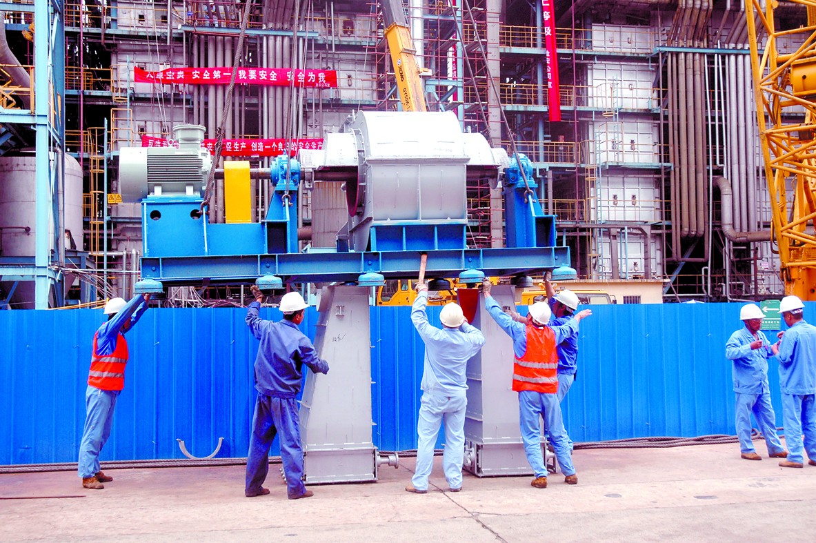 为降低装置能耗,扬子石化对老区乙烯装置5台裂解炉进行节能改造,使乙烯收率提高0.3个百分点,热效率提高2个百分点,乙烯能耗降低5.5%。图为工人正在吊装变频节能风机。